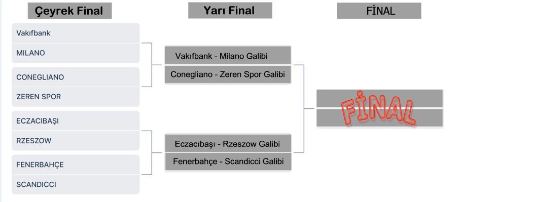 Diğer maçlar ise: Numia Vero Volley MILANO - VakifBank ISTANBUL ANKARA Zeren Spor Kulübü - A. Carraro Prosecco DOC CONEGLIANO Eczacibasi Dynavit ISTANBUL - KS Developres RZESZÓW Savino Del Bene SCANDICCI - Fenerbahçe Medicana ISTANBUL- İtalya basınında Galatasaray maçı: 'Juve tarihi başarıya çok yaklaştı'