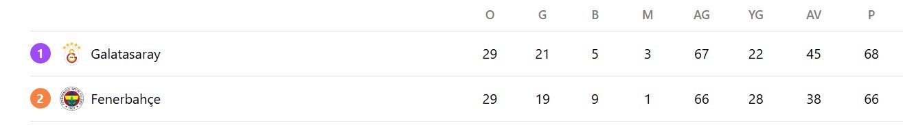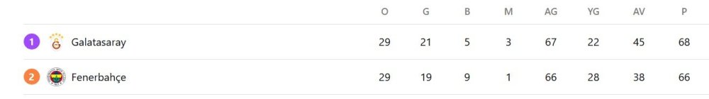 Ligin bitimine 5 maç kala Fenerbahçe ve Galatasaray arasındaki fark 2 puana düştü.... Kalan Maçlar: 29. Maç Günü 17.04. 12:00 Fenerbahçe - Rizespor 18.04. 12:00 Gençlerbirliği - Galatasaray 30. Maç Günü 17.04. 12:00 Fenerbahçe - Rizespor 18.04. 12:00 Gençlerbirliği - Galatasaray 31. Maç Günü 26.04. 12:00 Galatasaray - Fenerbahçe 32. Maç Günü 03.05. 12:00 Fenerbahçe - Başakşehir 03.05. 12:00 Samsunspor - Galatasaray 33. Maç Günü 10.05. 12:00 Galatasaray - Antalyaspor 10.05. 12:00 Konyaspor - Fenerbahçe 34. Maç Günü 17.05. 12:00 Fenerbahçe - Eyüpspor 17.05. 12:00 Kasımpaşa - Galatasaray- Galatasaray'la ilgili en son haberler