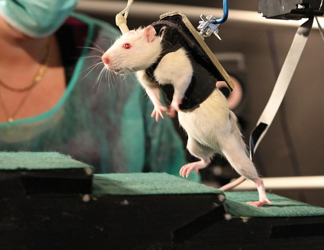 Sinir hücrelerini kimyasal ve elektrik ile uyaran bilim insanları, destekleyici mekanizma yardımıyla farelere yürüyüş antrenmanı yaptırdı. Yem olarak çikolata kullanıldı.
