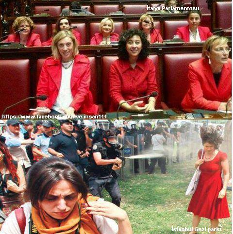 İtalyan kadın milletvekilleri Türkiye deki Gezi Parkı Direnişini ve Biber gazıyla müdahale edilen kırmızı elbiseli kadına desteğini göstermek için dün kadın milletvekilleri kırmızı elbiseler giyerek parlamentoya geldi.