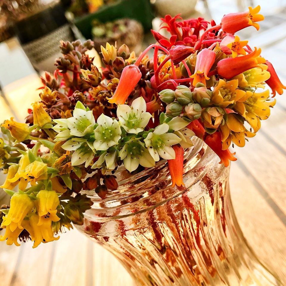 Farklı succulent türlerinin çiçekleri. Çiçeklendikçe kesiyorum üzülerek. Kesmediğimde kuvveti çiçeği gideceğinden bitkilerin gelişimi yavaşlıyor. Bende böyle demet yapıp suya koyuyorum.