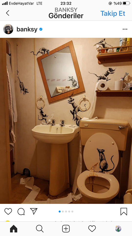 🐀Geçtiğimiz gün Banksy, evinin tuvaletinin duvarlarına çizdiği haylaz fareleri, "Eşim evden çalışmamı hiç sevmiyor" notuyla instagram hesabında paylaştı. 🐀Banksy’nin daha önceki eserlerinde de sıklıkla kullandığı fareleri sanatçının kendi banyosunu talan ederken görüyoruz. 🐀Farelerden biri duvara diş macunu fışkırtırken başka biri tuvalet kağıdı rulosu üzerinde koşuşturuyor. 🐀Aynanın yansımasından gördüğümüz bir diğer fareyse duvara çizdiği çizgilerle adeta karantinada gün sayıyor.