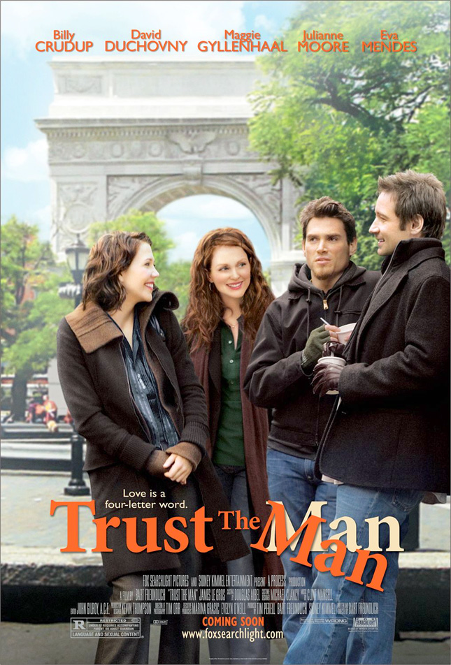 Erkeğe Güvenmek - Erkeğe Güven (2005) Trust the Man İşte size kadın erkek ilişkilerini anlatan çok güzel bir film. Kalabalık bir oyuncu grubu ve çok güzel oyun ortaya koyan bir grup sanatçı... Evli bir çift ve birlikte yaşayan diğer bir çift. Çiftler arasında Kadın ve diğer grup erkeği kardeş ve iki erkek çok iyi arkadaş olduğu gibi iki kadında sır ortağı. Biribirini anlamayan ve anlamamakta ısrar eden insanlar. Sonuç mu seyredin ve görün... Özellikle Maggie Gyllenhaal (SherryBaby ve Sekreter filminden hatırlayacaksınız) öyle güzel oynamışki Julianne Moore'da onu takip etmiş. Kaçırmayın günlük yaşamınızdan bir şeyler bulacağınız güzel bir film.. Love is a four-letter word. Aşk üç harfli bir kelimedir. Yönetmen: Bart Freundlich Oyuncular: Billy Crudup, Eva Mendes, Julianne Moore, Maggie Gyllenhaal, David Duchovny, Ellen Barkin, Dagmara Dominczyk, Bob Balaban, Justin Bartha, James LeGros This intimate look at modern-day New York City relationships follows the romantic lives of two siblings, both of whom are having problems with their mates. Picking up the pieces of her crumbling marriage to a sex addict (David Duchovny), Rebecca (Julianne Moore) agrees to a trial separation. Meanwhile, her brother Tobey (Billy Crudup) is missing the spark he once had with Elaine (Maggie Gyllenhaal), his long-term girlfriend. Director: Bart Freundlich Cast: Billy Crudup, Eva Mendes, Julianne Moore, Maggie Gyllenhaal, David Duchovny, Ellen Barkin, Dagmara Dominczyk, Bob Balaban, Justin Bartha, James LeGros Filmden sahneler:
