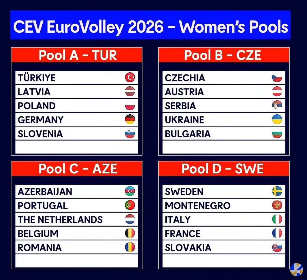 Gönderi tarihi: 18 saat önce18 saat Yazar Admin Kadınlar Voleybolda 2026 Avrupa Şampiyonasında Fikstür ve Gruplar belli olduFilenin Sultanları'nın 2026 CEV Avrupa Voleybol Şampiyonasındaki Rakipleri Belli OlduA Milli Kadın Voleybol Takımımızın, 21 Ağustos-6 Eylül 2026 tarihlerinde 24 takımın katılımıyla Türkiye, Çekya, Azerbaycan ve İsveç'in ev sahipliğinde düzenlenecek 2026 CEV Kadınlar Avrupa Voleybol Şampiyonasındaki rakipleri belli oldu.İtalya'nın Bari kentinde gerçekleşen kura çekimine Türkiye Voleybol Federasyonu (TVF) Başkanı Mehmet Akif Üstündağ ve TVF Genel Sekreteri Av. Nihal İşçi de katıldı. A Milli Kadın Voleybol Takımımızın sporcusu Dilay Özdemir ise kura çekimini gerçekleştiren isimlerden biri olarak yer aldı.Filenin Sultanları grup aşamasında A Grubu'nda yer alacak ve Letonya, Polonya, Almanya, Slovenya ve Macaristan ile mücadele edecek.Türkiye, 2026 CEV Kadınlar Avrupa Voleybol Şampiyonası'na üçüncü kez ev sahipliği yapacak. Türkiye daha önce 2003 ve 2019 yıllarında organizasyona ev sahipliği yapmıştı. A Milli Kadın Voleybol Takımımız, bu dev organizasyona son şampiyon apoletiyle katılacak.2026 CEV Kadınlar Avrupa Voleybol Şampiyonası'nın Türkiye ayağında grup etabı, son 16 turu, çeyrek final, yarı final ve final müsabakaları oynanacak. Tüm müsabakalar, Sinan Erdem Spor Salonu'nda oynanacak.2026 CEV Kadınlar Avrupa Voleybol Şampiyonası'nda diğer gruplar şöyle:B Grubu: Çekya, Avusturya, Sırbistan, Ukrayna, Bulgaristan, YunanistanC Grubu: Azerbaycan, Portekiz, Hollanda, Belçika, Romanya, İspanyaD Grubu: İsveç, Karadağ, İtalya, Fransa, Slovakya, Hırvatistan